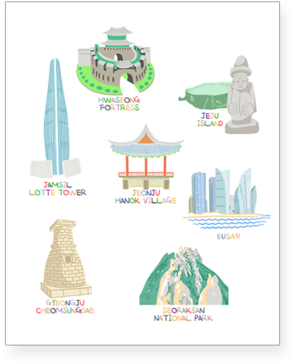 Enjoy playful temporary tattoos featuring Korea's iconic tourist attractions.